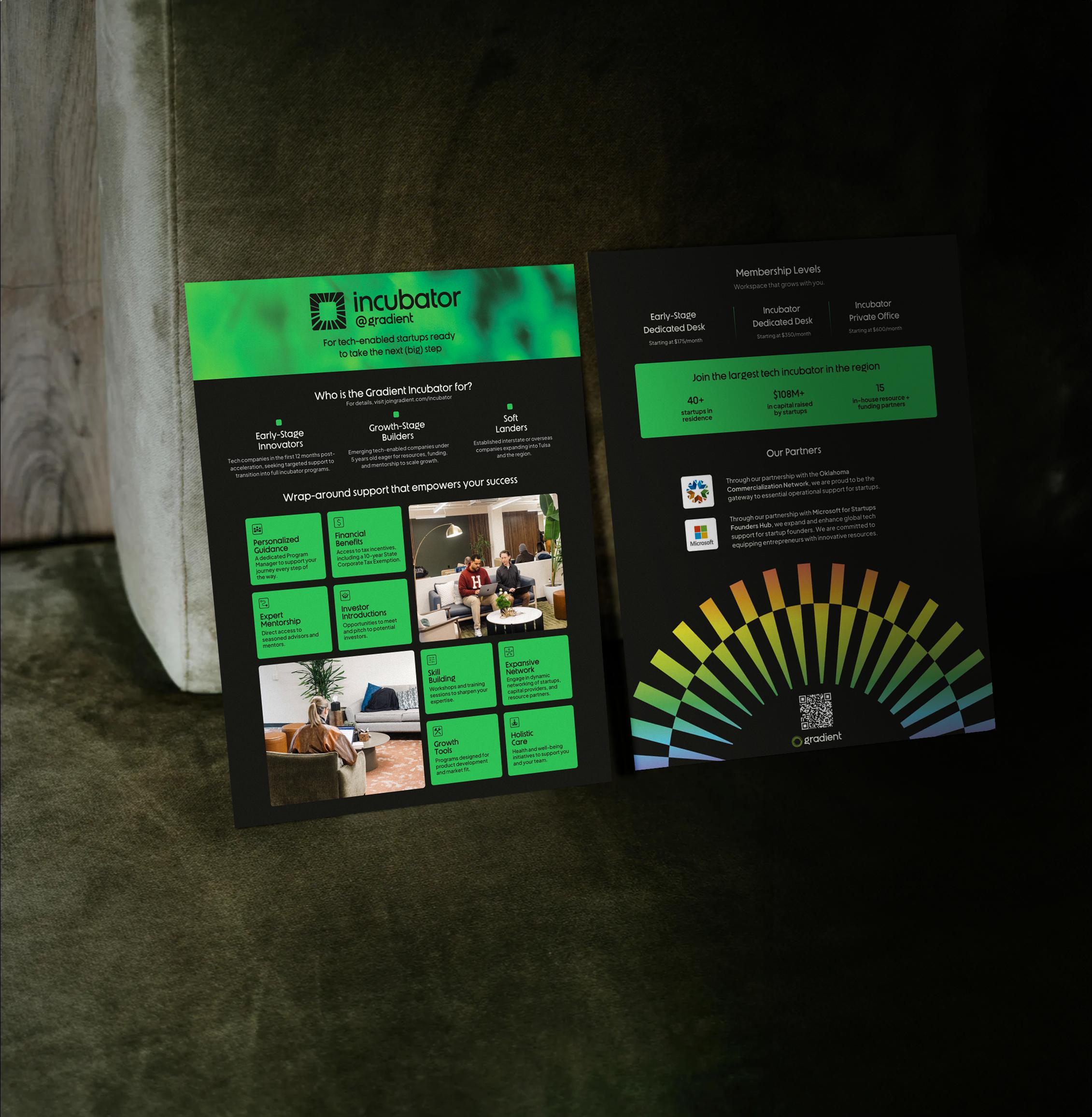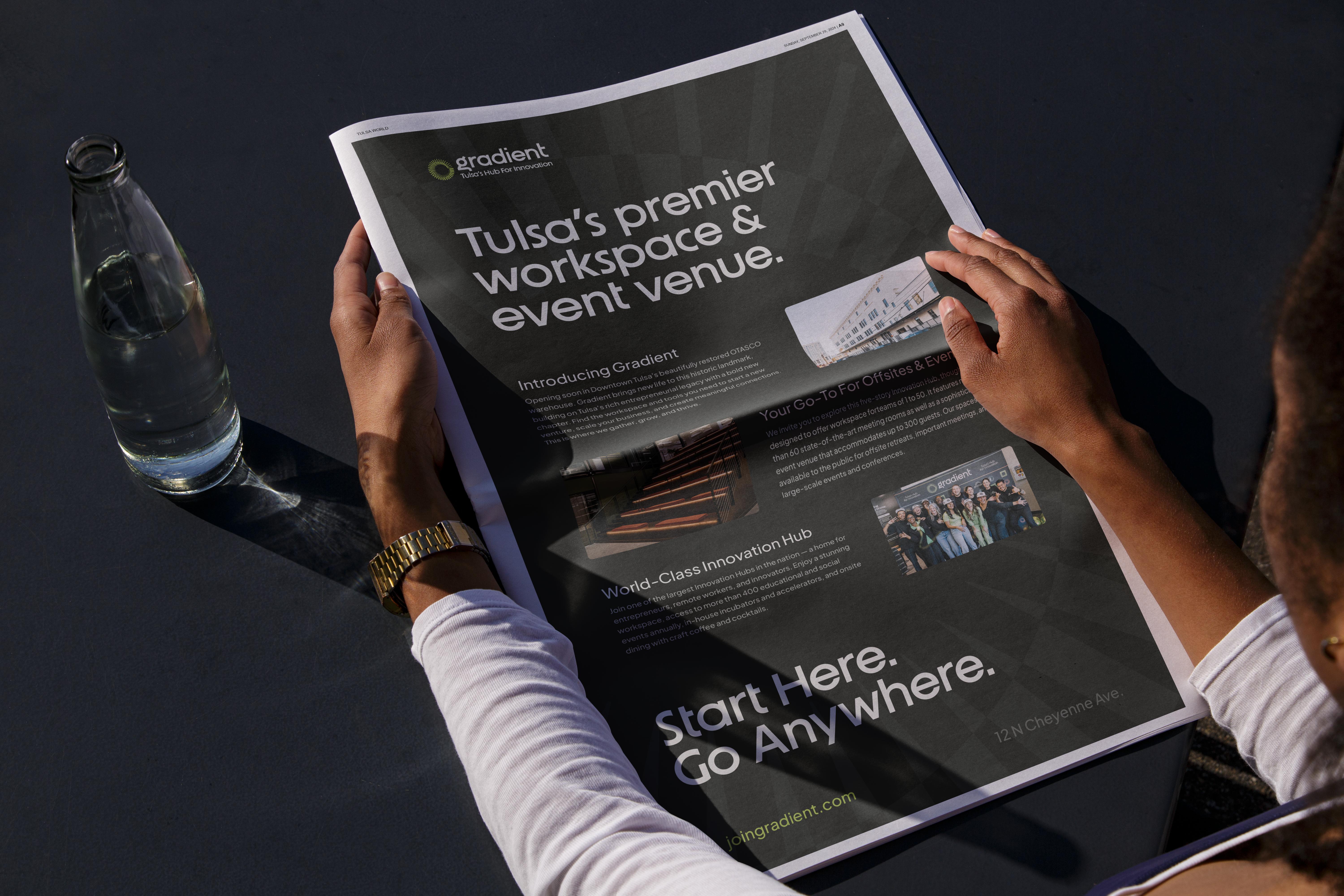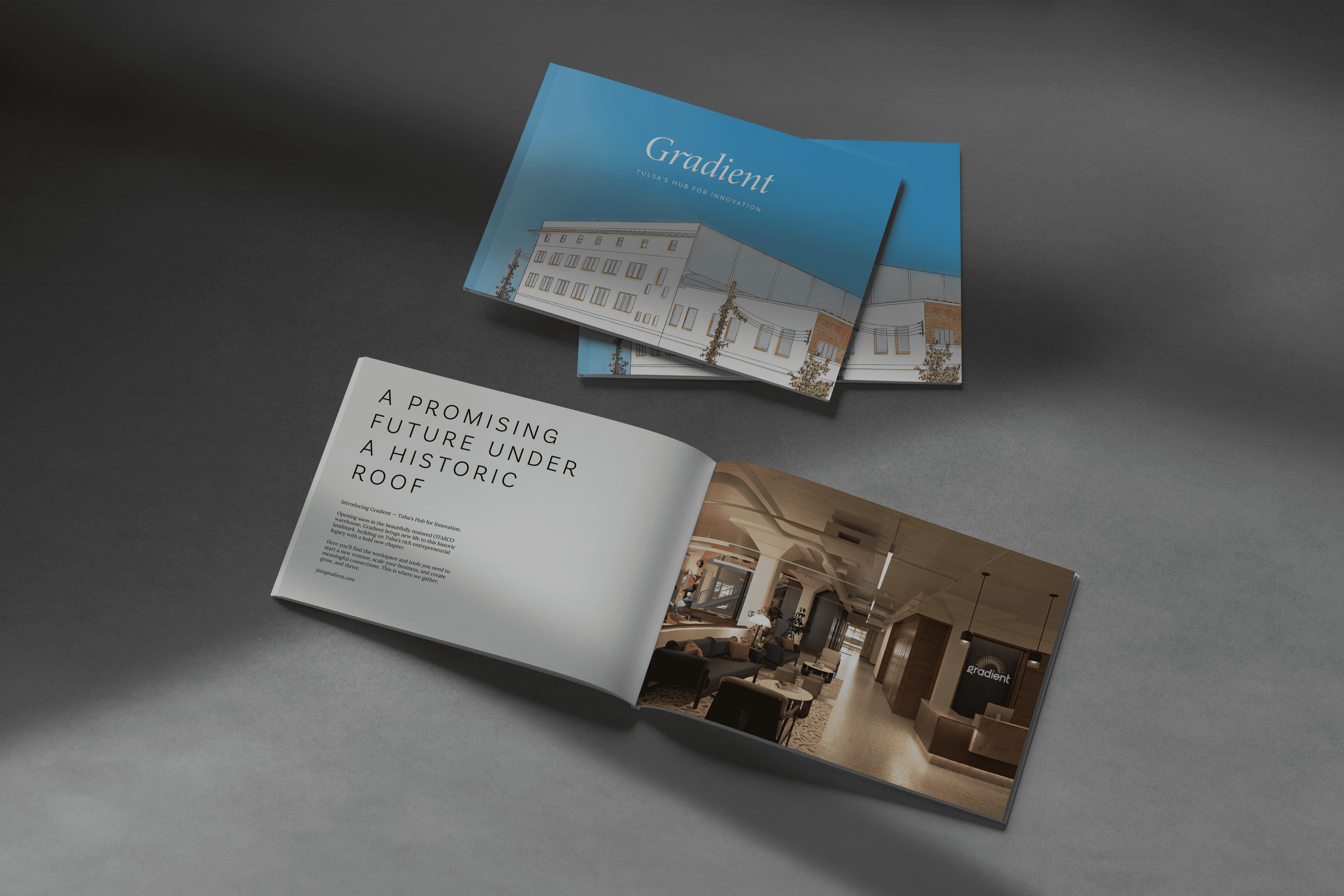 I've been a creative partner with Gradient—the 5th largest innovation hub in the nation—for 6+ years. I collaborate with their VP of Marketing, CEO, and executive leaders to build annual Impact Reports, campaign and program branding, environmental design, and creative storytelling touch-points. I concept and pitch creative ideas as well as execute on existing creative direction across print, digital, and swag. With the launch of its new 112,000 sq ft building, I led creative design for GTM sales materials that contributed to 70%+ occupancy for Gradient in its first year.